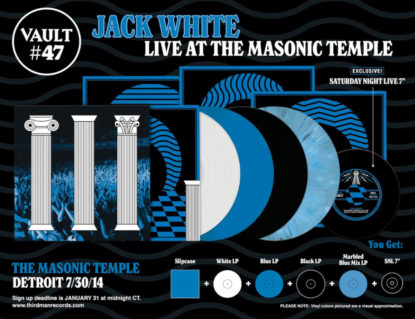 Jack White will release his July 30th, 2014 concert at Detroit’s Masonic Temple on vinyl via Third Man Records, the singer-songwriter announced on Monday. The release will mark the 47th Vault package from his record label and will be available to those who subscribe by January 31st. A preview of the album is available now with a live cut of “Missing Pieces”.