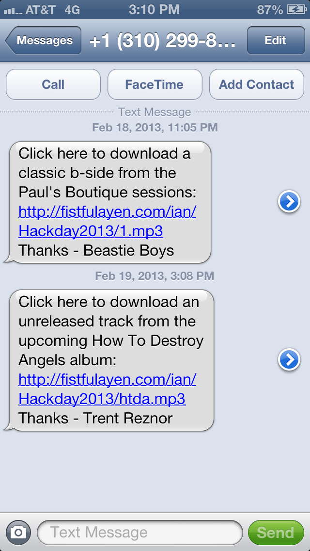 “When you dial (310) 299-8756, press two and choose what artist you’d like to leave a message for. For Beastie Boys, press one. For Trent Reznor, press two. Once you leave a message, press pound and stay on the line. You’ll then hear the new track you just unlocked. After you hang up, you’ll get a text via Twilio SMS with a link to download the track you just heard.”