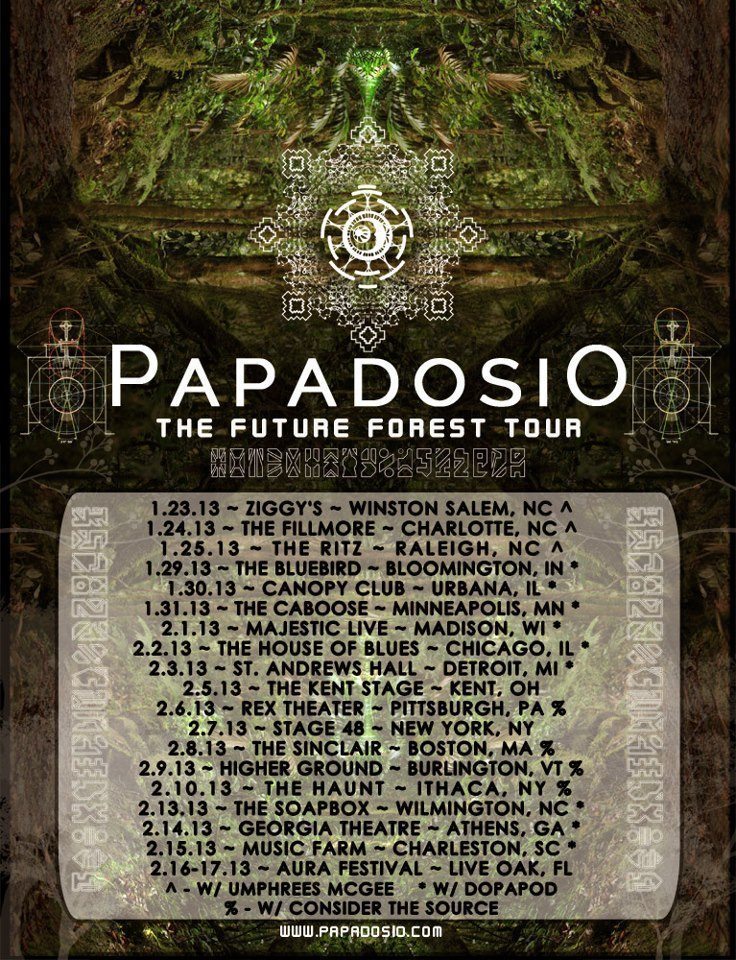 Their most recent album T.E.T.I.O.S., an abbreviation of “To End The Illusion of Separation” took over 3 years to make. Comprised of 2 discs, and 20 tracks, the entire album plays for about two hours. Each track has a specific piece of artwork created for it, and in total the album comes with a 24-page art portfolio. Papadosio offers the album in nearly every format possible, with each format providing the artwork of the album. T.E.T.I.O.S has a spiritual influences stemming from it. Lyrically, Thogmartin sings about love, human relations, and nature. The artwork enhances the sounds and the lyrics, creating a romantic and transcendental sense to the album. Papadosio’s website states the album to be “an effort to catalyze the beautiful and peaceful world that we all know is possible, we give you this collection of art as a sign that we are all moving into that space slowly but surely.”